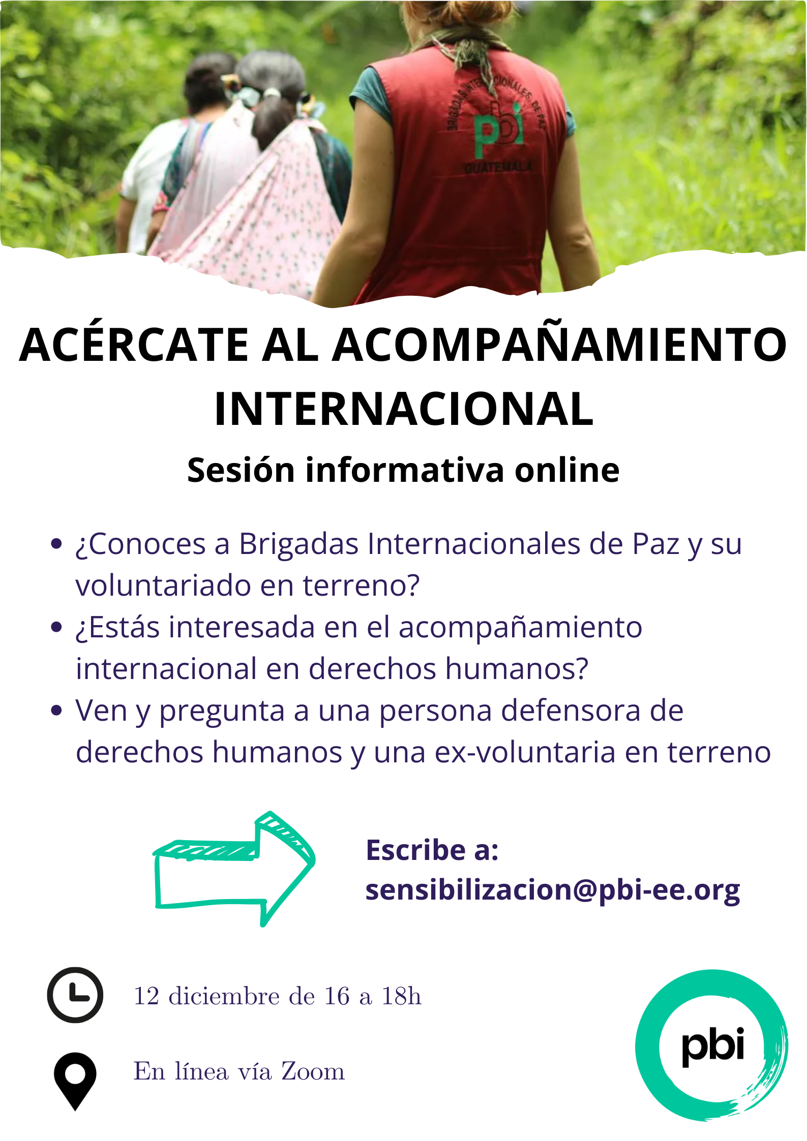 📌 12 de diciembre – 18:00h. Sesión informativa online “Acércate al acompañamiento internacional”. Si te interesa el acompañamiento global en derechos humanos y quieres saber más sobre el trabajo de PBI, te invitamos a nuestro seminario online.