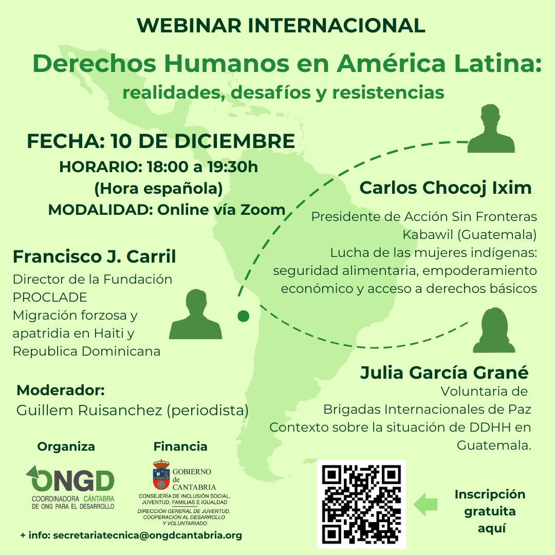 📌 10 de diciembre – 18:00h. Webinar Internacional “Derechos humanos en América Latina: realidades, desafíos y resistencias”. Participamos a través de PBI-Guatemala en esta actividad organizada por la Coordinadora Cántabra de ONGD donde abordaremos el panorama actual de los Derechos Humanos en Guatemala.
